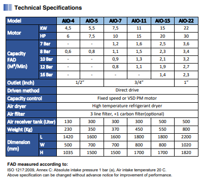 All-in-One screw compressor means tank-mounted screw air compressor with air treatment that supplies clean and dry compressed air with easy installation. Suitable for light scale home industry, resident area industry and workshop.